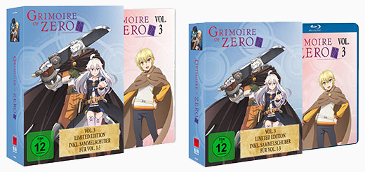 GRIMOIRE OF ZERO wird als DVD und Blu-ray auf insgesamt drei Volumes veröffentlicht: Das am 21. September erscheinende Abschlussvolume 3 enthält die finalen Episoden 9 bis 12 und kommt in limitierter Erstauflage mit einem exklusiven Sammelschuber in den Handel.